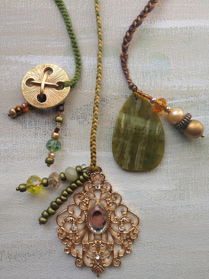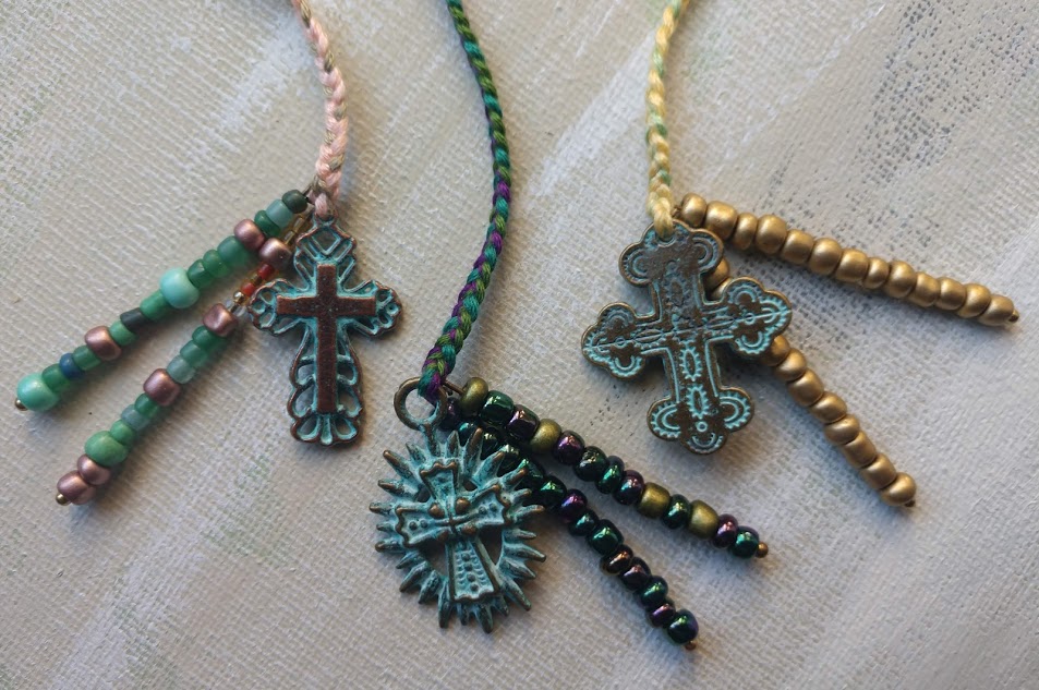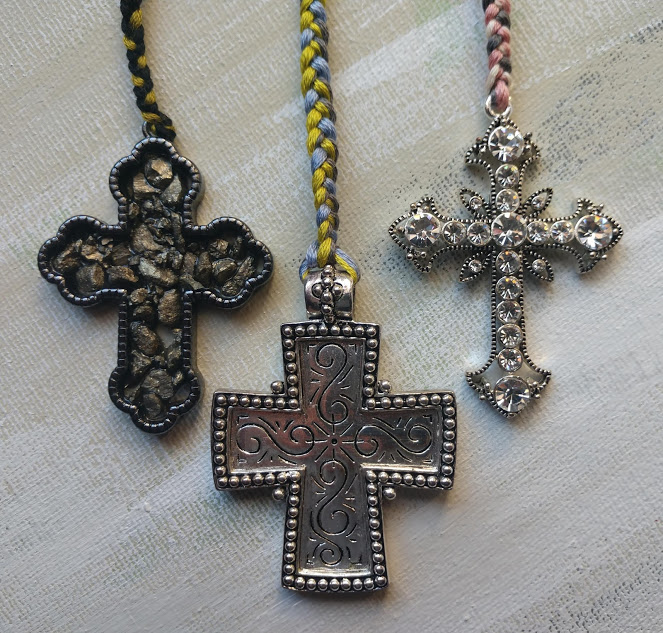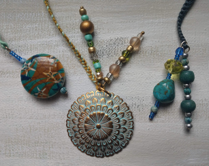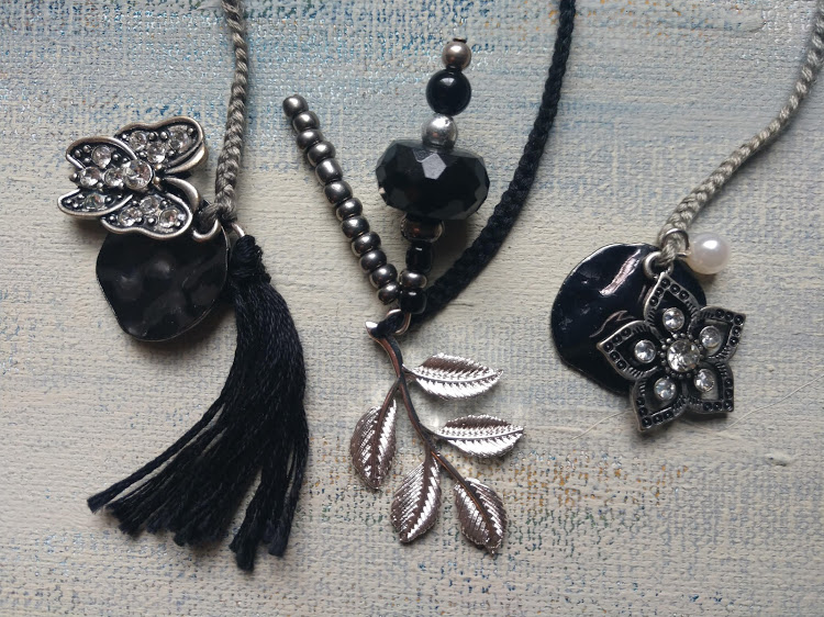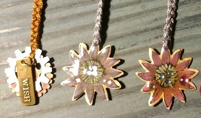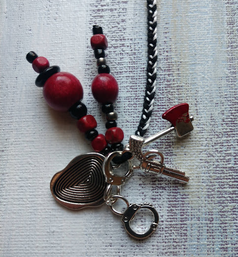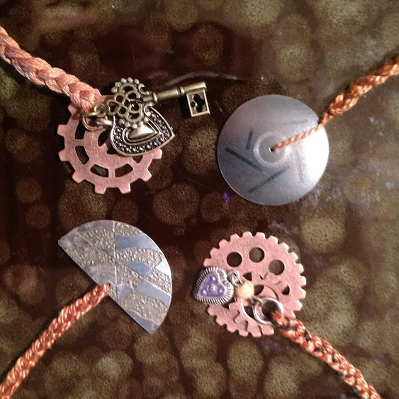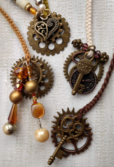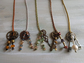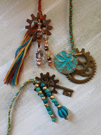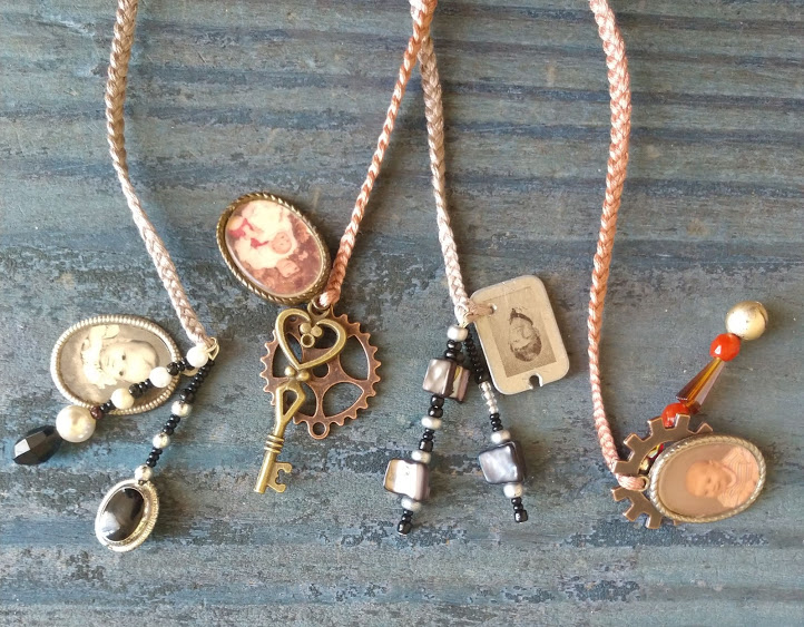 A trio of bookmarks made with black beads and assorted silver pendants. A variety of greens, blues, glass beads, and mixed metals. A sparkling trio of deconstructed vintage brooches.Lots of earth tones and mixed metals.A green turquoise pendant, a gold sand dollar, and assorted glass beads and pearls. A beautiful combination of distressed metals and faux gems. Patinaed religious motifs with assorted gold and irridescent glass beads. Pretty in pink with shimmering faux pearls, silver leaf motif pendant, and glass beads. Vintage deconstructed Designs from the Deep earrings and mixed metal steampunk gears. Vintage deconstructed Lewis & Huebner earrings and steamunk gears.A trio of blue beads and steampunk gears and keys. Detailed steampunk gears, keys, and clock charms with earth tones glass beads. Lots of fun and beautiful pendants, vintage earrings, steampunk gears, and other baubles.True crime bookmark charms for all the true crime fans. Customized family locket bookmarks.Customized steampunk bookmarks for a book publisher.Customized for a local author.